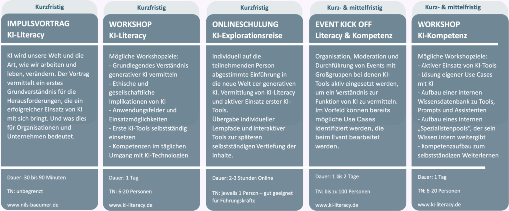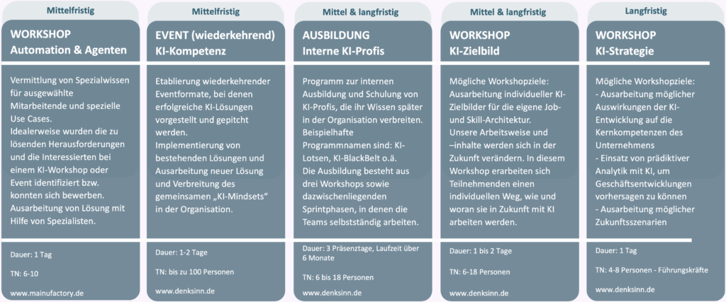 So können wir Sie bei Bedarf in allen Phasen der KI-Reise begleiten und unterstützen. Natürlich sind die Übergänge zischen den Phasen fließend und sollten strategisch aufeinander abgestimmt sein. Daher bieten wir neben unseren üblichen Angeboten auch die individuelle strategische Beratung durch die DenkSinn GmbH an. Fragen Sie gerne an.