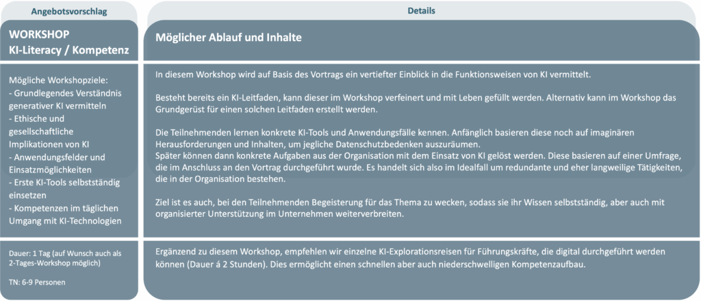 Vertiefen Sie die Erkenntnisse durch einen Workshop, bei dem erste KI-Kompetenz aufgebaut wird. Durch den aktiven Einsatz erster KI-Anwendungen und der Ausarbeitung geeigneter Anwendungsfelder im Unternehmen.