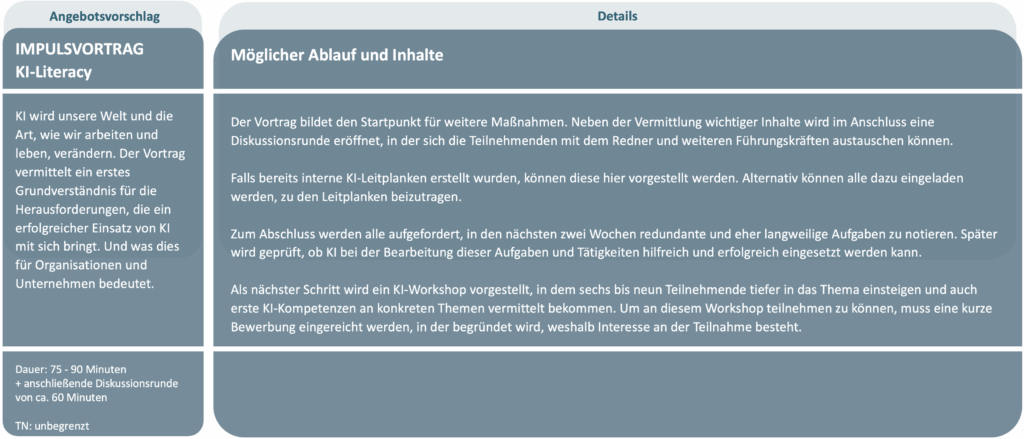 Starten Sie mit einem Vortrag zum Thema „KI-Literacy”, um ein grundlegendes Verständnis und einen reflektierten Umgang mit Künstlicher Intelligenz zu vermitteln.